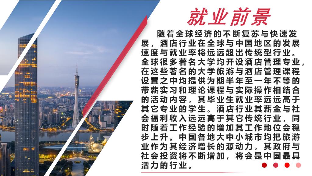 酒店管理是全球热门行业,行业紧缺酒店高级管理人才。酒店管理专业培养面向高星级酒店、餐饮企业及泛服务业,具备良好的职业道德、素养和技能,具有合作精神,掌握现代高端服务业经营管理方法的国际化、应用型高级管理人才。专业紧密围绕高端服务行业对人才的需求办学,以酒店管理专业为特色,聚焦旅居新业态,如民宿、露营地、旅游房车等,与国际、国内酒店集团合作打造人才培养基地,提供一线城市实习和就业机会,不断探索应用型人才培养模式。考研和就业率达到100%。