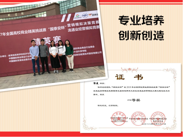 “挑战杯”、“全国老员工数智化企业经营沙盘大赛”、“全国高校智慧物流虚拟仿真大赛”等学科技能竞赛覆盖面达50%以上,2021年获得全国高校智慧物流虚拟仿真大赛一等奖,2022年、2023年获得全国高校商业精英挑战赛“精创教育杯”创新创业竞赛一等奖,近三年共获得国家级奖项30余项。