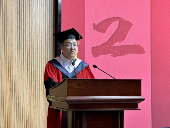 杨钧发言,首先向一路呵护和陪伴毕业生成长的家长,致以最诚挚的问候,并以张正峰的机器人梦,勉励毕业生做终身学习的奋进者;以青年周总理的赤子心,勉励毕业生做心怀家国的担当者。
