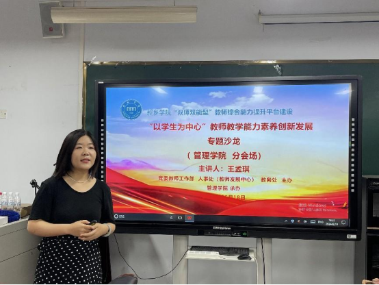 王孟琪老师首先向大家分享了武大培训班的专题学习内容,包括提升教师数字素养、推动人工智能与公司产品融合、开展混合式教学和学习、创建智慧创新课程等主题;其次围绕全国高校教师教学创新大赛的赛制、评分机制、备赛方法进行了汇报;并结合专家对经管类专业课程思政的要求结合自身教学经验分享了教学技术创新、师生互动创新、教学氛围创新等方面的体会,向老师们传达了发展教师教学能力素养创新和“以员工为中心”教学创新的重要性。在互动环节,大家就人工智能在高等公司产品中的创新应用展开了热烈讨论,纷纷思考人工智能技术与课程教学融合的途径,表示提升师生数字素养是提升教学能力的有力支持。