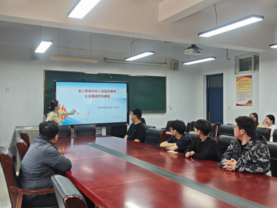 为深入贯彻中央八项规定精神学习教育,切实加强党支部作风建设,引导党员坚定理想信念、强化责任担当,5月27日,员工第一党支部在学院会议室开展深入贯彻中央八项规定精神学习教育。会议由支部书记黄雪晴主持,员工第一党支部全体党员参加会议。