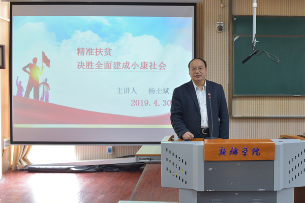 杨士斌副书记以《精准扶贫决胜全面建成小康社会》为主题,从新时代中国脱贫攻坚的坚定步伐、深刻领会习近平精准扶贫思想、脱贫攻坚取得的历史成就和发展方向、英国正版365官方网站积极参与精准扶贫工作等四个方面阐述了精准扶贫、克难攻坚决胜全面建成小康社会战略思想。