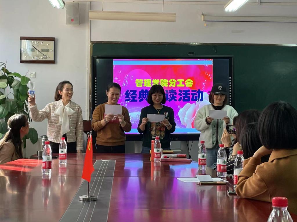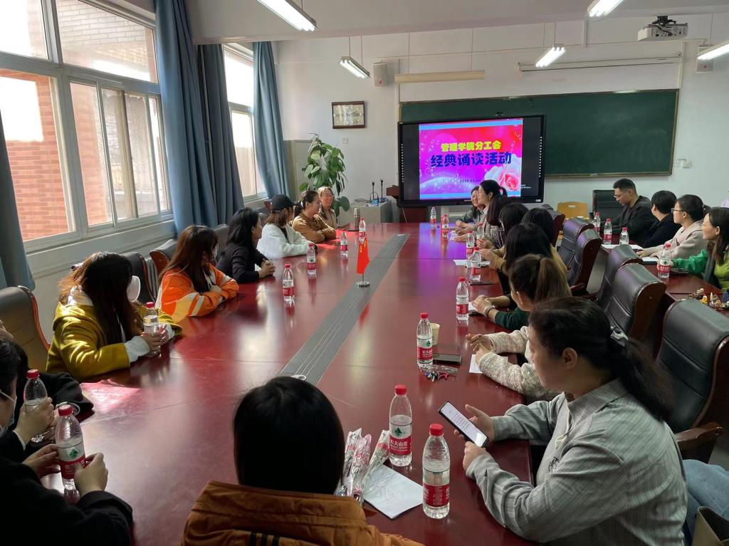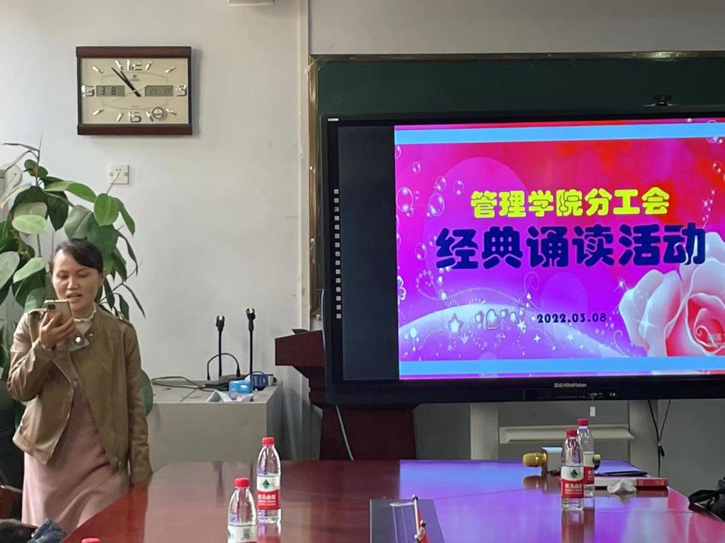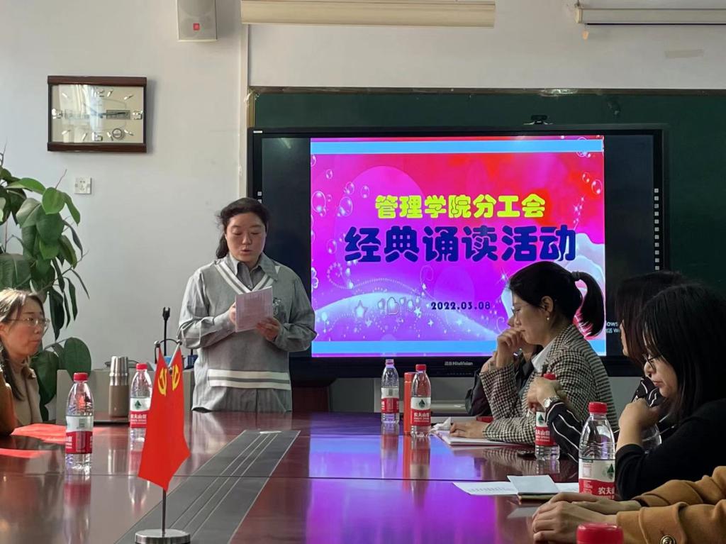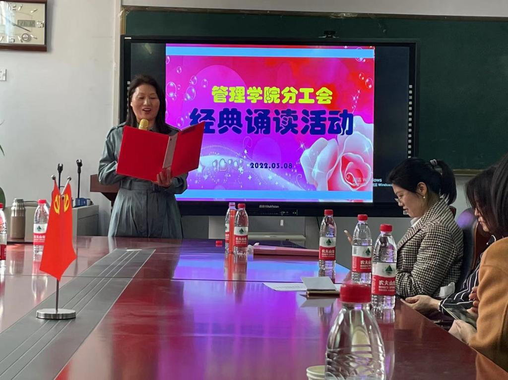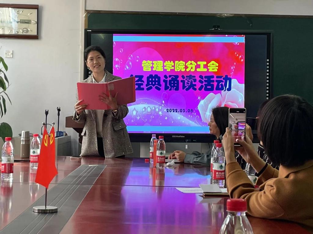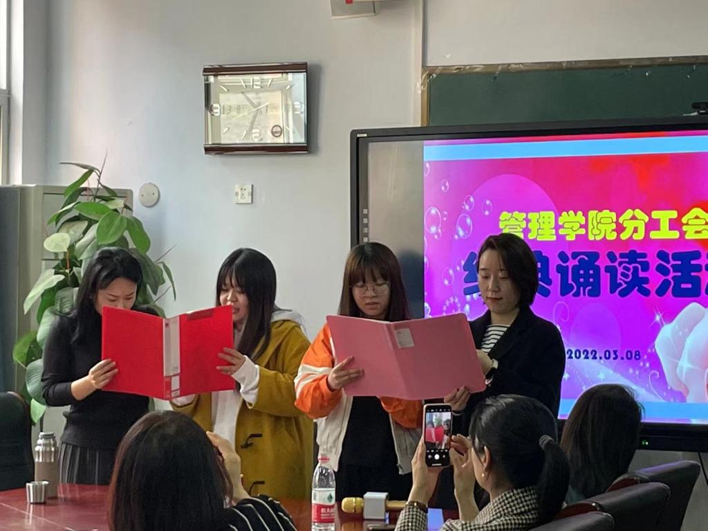 此次诵读经典与“三八”妇女节相结合 ,紧扣“拥抱新时代,创造新生活”这一主题,女教工们通过单人、双人甚至组合等多种形式,选择部分经典文章歌颂女性、母爱及美好幸福生活。在优美动听的配乐声中,女教工们的诵读如潺潺流水掠过心间,诵读现场时而安静而温馨,时而激情又澎湃。大家的精彩演绎赢得了阵阵掌声,王韵、宋路平、王孟琪、王璐创作的三句半《姐妹们加油干》更是将活动推向了高潮。在诵读声中大家彼此感受着心灵的碰撞与共鸣,分享经典之时也领略到其中蕴含的文化精髓。