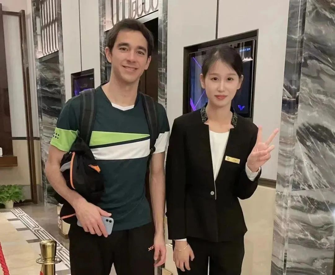 朱晓静和巴西乒乓球选手雨果·卡尔德拉诺合影