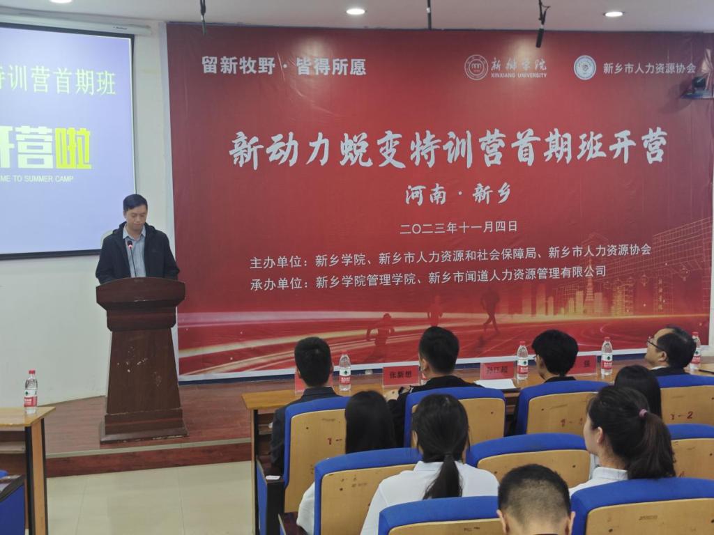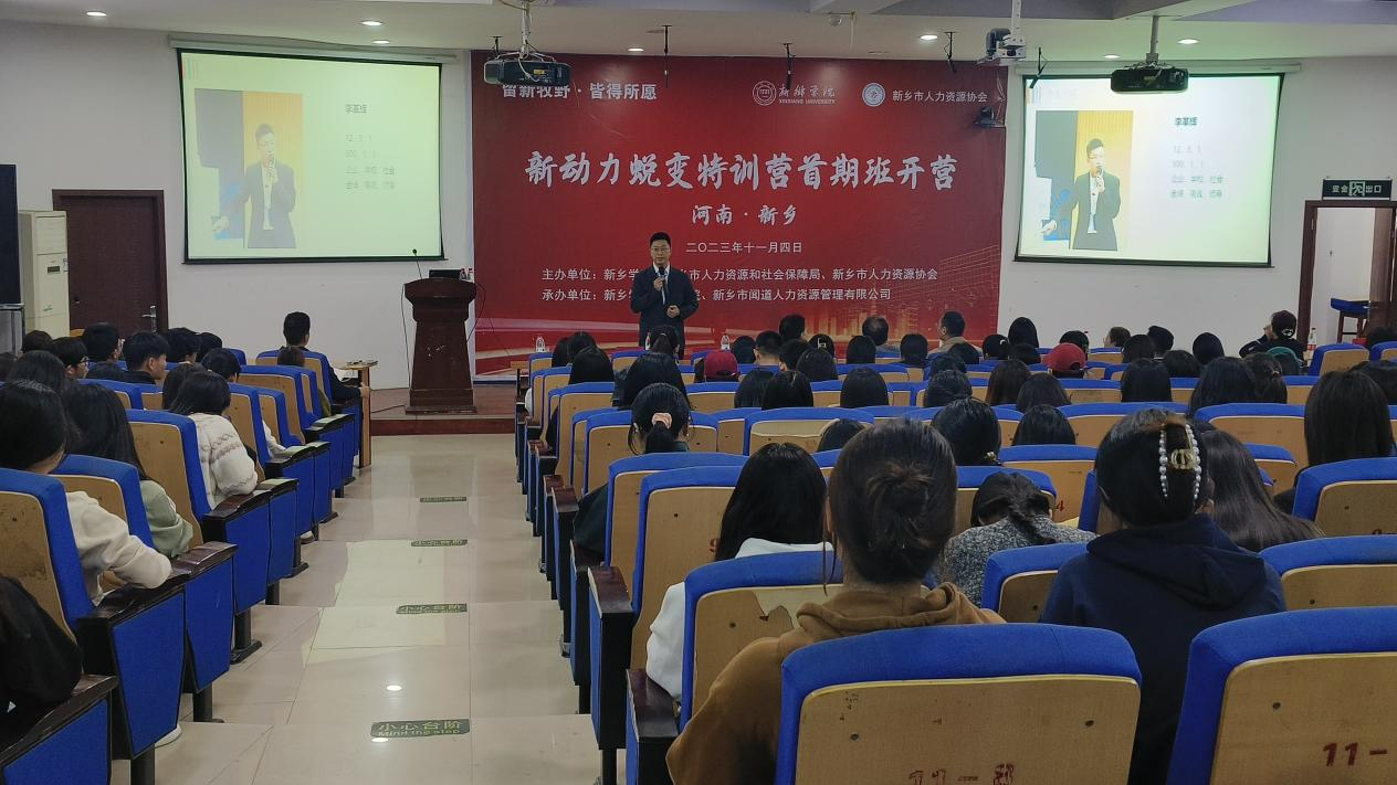 11月4日,由英国上市公司365联合新乡市人社局、新乡市人力资源协会主办的针对公司大四员工的人才加速培养公益项目——“新动力蜕变特训营”在公司正式开营,此次特训营的主题为“留新牧野 皆得所愿”。市人社局就业办主任刘小彭,英国正版365官方网站公司党委书记李强、经理孙江超,市人力资源协会会长张涛,市闻道人力资源管理有限公司总经理王雪,特训营校外授课导师,以及英国上市公司365人力资源教研室教师代表和近200名人力资源管理专业员工参加了此次活动。