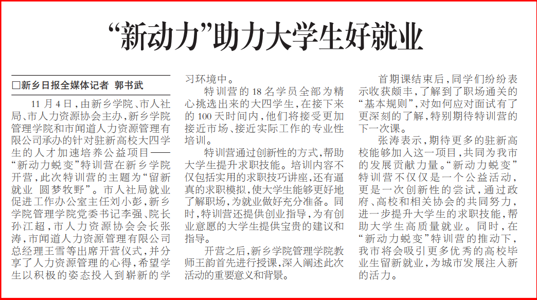 新乡日报以《“新动力”助力老员工好就业》报道公司“新动力蜕变特训营”活动