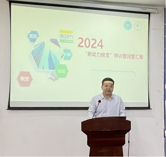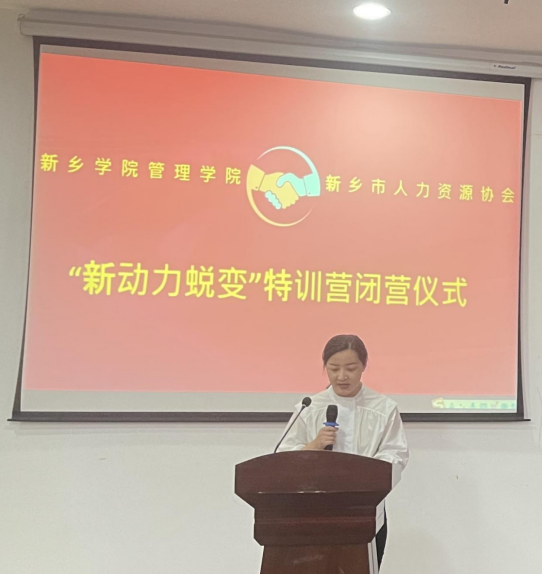 随后,新乡市人力资源协会会长、特训营班主任张涛上台做项目回顾及总结。他详细介绍了特训营的课程设置、团队力量、教学方法等方面的内容。通过生动的案例和具体的数据,张会长展示了学员们在培训期间取得的显著进步和成就,同时也对他们在未来职业道路上的发展提出了殷切的期望。他表示,特训营的成功举办离不开学院领导的大力支持、授课讲师的辛勤付出以及学员们的积极参与。