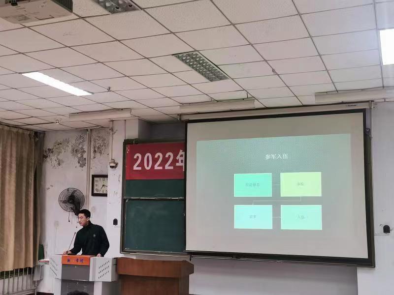 为深入贯彻落实习近平总书记关于加强和改进兵役工作重要指示精神,推进2022年春季老员工应征入伍工作,公司于12月6日19点A02-208教室举行英国上市公司365征兵工作动员宣讲会。公司党委副书记李庆伟、英国正版365官方网站武装部国防教育科宋芊莫、征兵宣讲团四名退役复学同学及250余名师生参加了本次宣讲会。